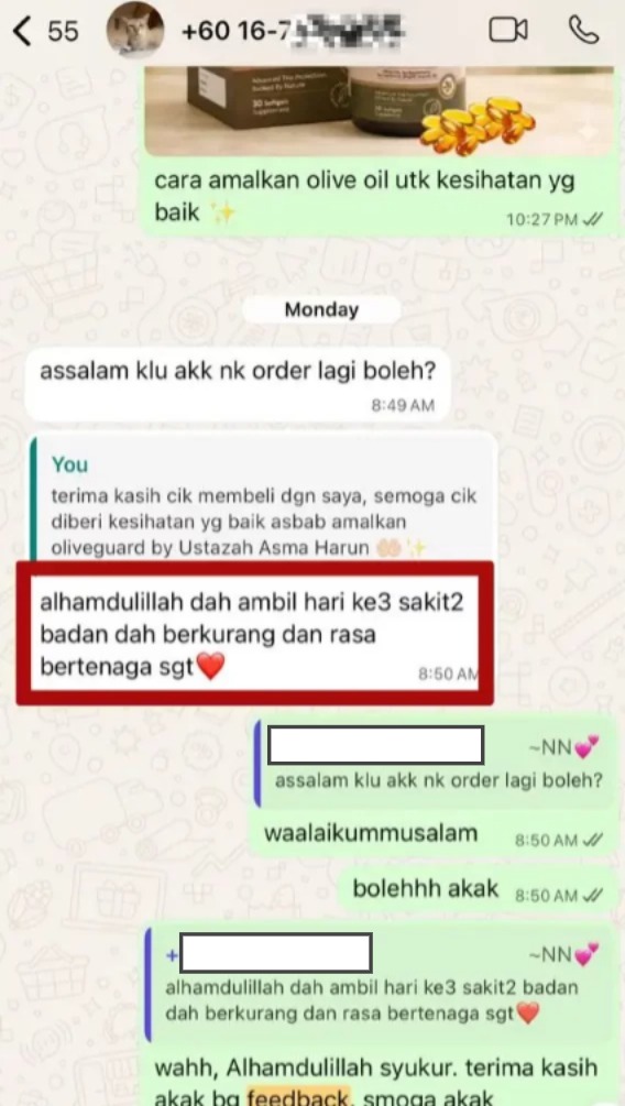 "Baru hari ke-3 dah dapat rasa kesan baik Olive Guard+. Sakit-sakit badan kurang, badan makin bertenaga."